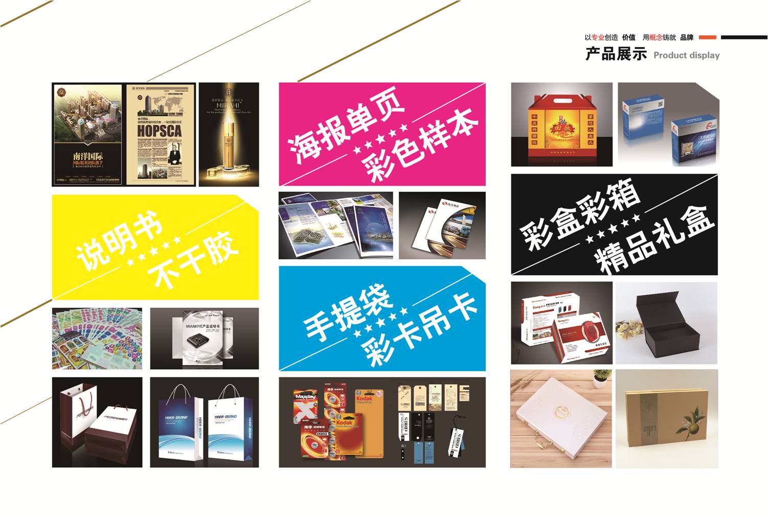 公司主营业务包括:产品包装盒、企业画册、宣传海报、礼品盒、产品样本、台历挂历、瓦楞纸包装盒、房产楼书、标签、说明书、名片等,我们与客户共同努力的目标,是以竞争为导向的品牌服务。